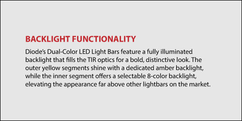 Fully Illuminated Backlight. The SS30 Dual-Color LED Light Bar features an integrated backlight that fully illuminates the TIR optics, providing a custom look that sets your ride apart. The outer yellow segments feature a brilliant amber backlight, while the inner segment features a selectable multicolor backlight in your choice of eight colors. The amber backlight color has been upgraded to a dedicated amber chip, part of a full RGBWA series of LEDs to produce true amber output. Selecting the backlight color of the inner segment is easy - simply alternate the power on and off. There's no complicated programming with a controller!
