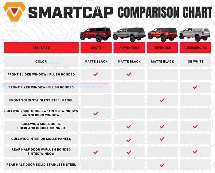 When upgrading your truck for overlanding or work, SmartCap offers four rugged truck cap models, each engineered for different needs. Whether you're chasing adventure, building a mobile workspace, or creating a custom rig, there’s a SmartCap for you. Let’s compare the EVO Sport, EVOa Adventure, EVOc Commercial, and EVOd Defender.